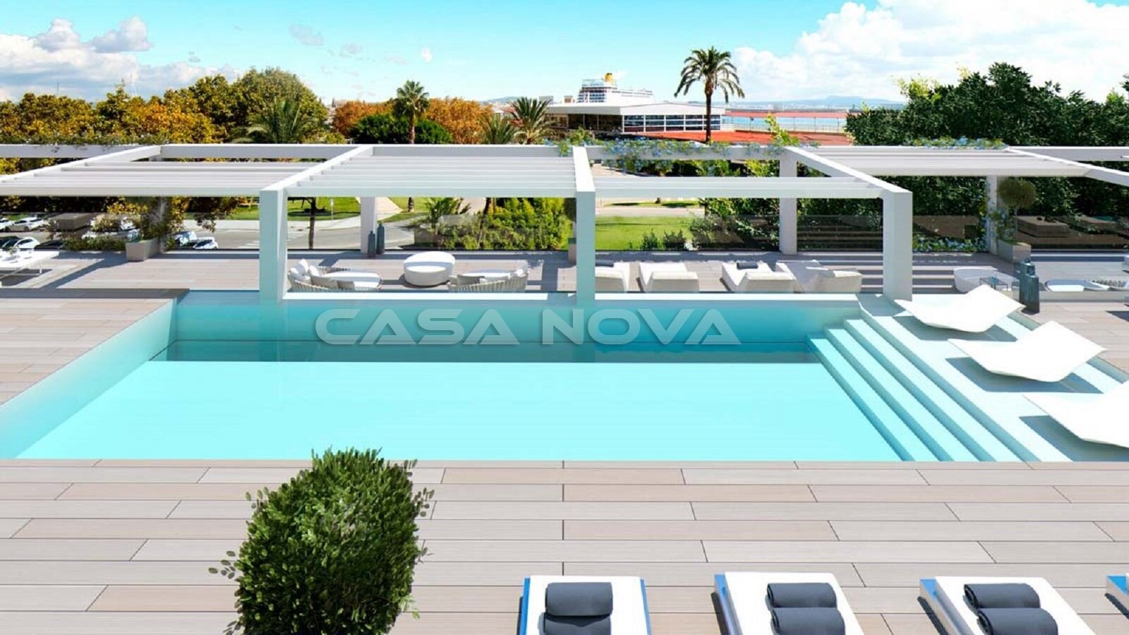 Neubau Immobilien Mallorca: Edles Erdgeschossapartment in der modernen und kosmopolitischen Inselhauptstadt Palma de Mallorca. Diese Neubau- Wohnanlage wurde Ende des Jahres 2022 fertiggestellt.