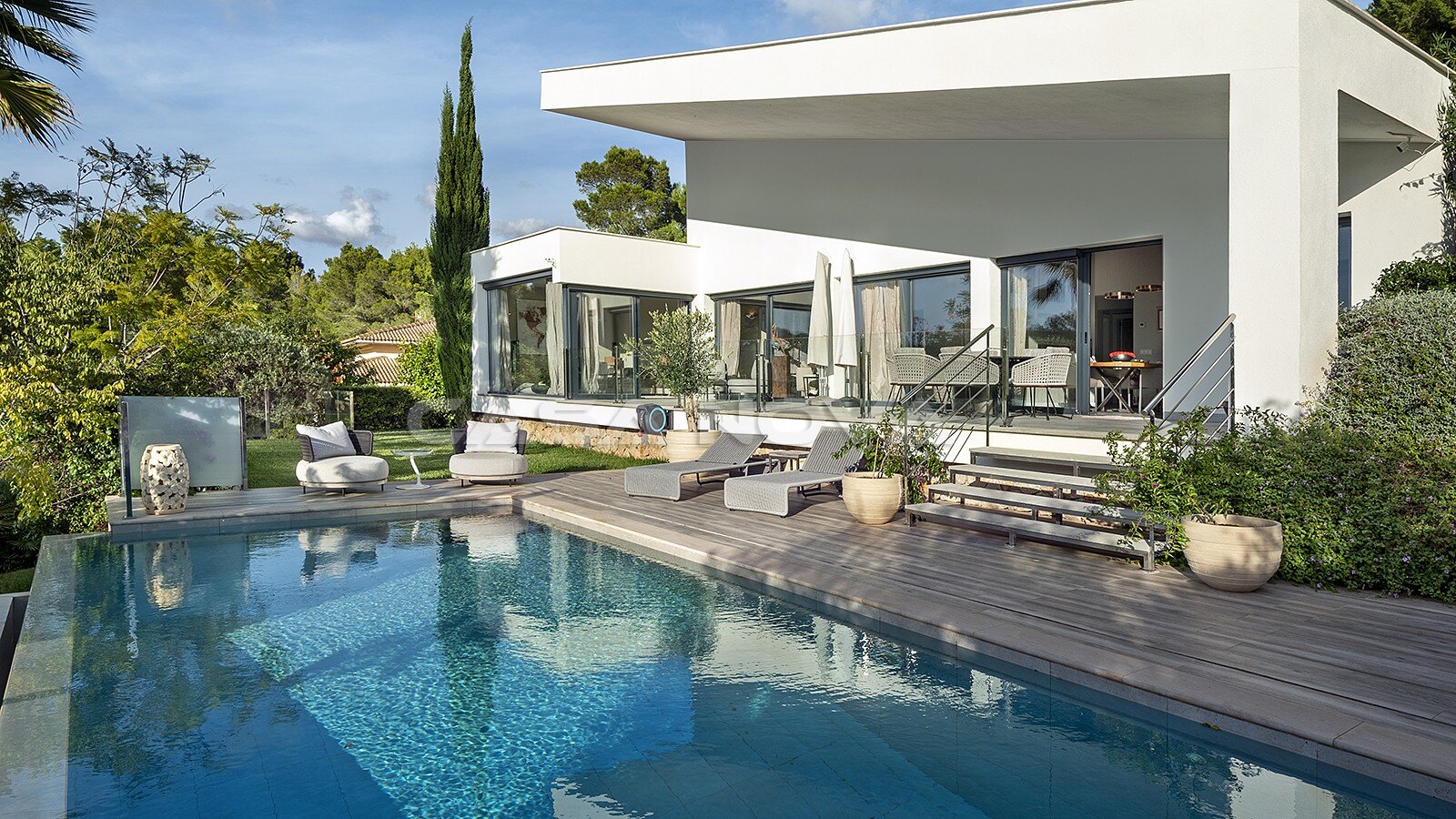 Die moderne Immobilie wurde im Jahr 2018 auf einem ca. 1.276 m² großen Grundstück in leichter Hanglage konstruiert. Beim Betreten der ca. 290 m² großen Villa gelangen Sie über einen großzügigen Eingangsbereich in das helle und elegante Wohnzimmer mit offenem Grundriss, Kamin und Zugang zur sonnigen Terrasse, die einen fantastischen Blick bietet. Im Esszimmer können Sie angenehme Abende mit Familie und Freunden verbringen, während die Einbauküche mit Elektrogeräten der Marke Siemens ausgestattet ist. Insgesamt gibt es 4 Schlafzimmer und 3 Badezimmer, davon 2 en Suite. Alle Zimmer verfügen über große Einbauschränke für optimalen Stauraum. Die Luxusvilla ist umgeben von einem schön gestalteten Garten mit einem großen, beheizbaren Salzwasser- Pool. Eine überdachte Terrasse von ca. 40 m2 und eine Sonnenterrasse von ca. 60 m2 laden zu gemütlichen Stunden im Aussenbereich ein. Darüber hinaus gibt es einen Hauswirtschaftsraum, einen Abstellraum, einen großzügigen Keller und eine Gästetoilette. Zur Ausstattung der Luxusvilla gehören eine zentrale Klimaanlage, Fliesenboden, Fußbodenheizung, die über eine Wärmepumpe betrieben wird, doppelt verglaste Aluminiumfenster mit elektrischen Jalousien, Musikanlage, Domotic-System (computergesteuerte Haustechnik), eine Alarm- und Video-Gegensprechanlage, automatische Bewässerung, eine Osmose- sowie eine Filteranlage für Trinkwasser. Ein Garagenplatz für zwei Autos und weitere Stellplätze runden das Angebot ab.
