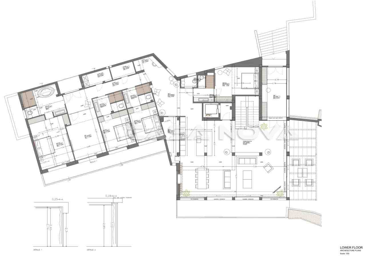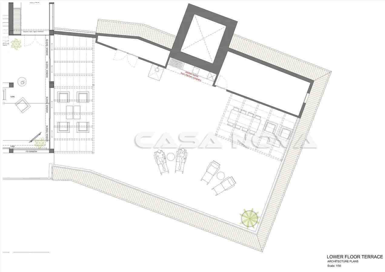 Dieses moderne und stilvolle Penthouse wurde im Jahr 2024 renoviert und verfügt über eine bebaute Fläche von ca. 351 m2. Über den Eingangsbereich gelangen Sie in das helle Wohn-Esszimmer mit deckenhohen Schiebetüren. Von dort aus haben Sie Zugang zur Terrasse mit spektakulärem Meerblick. Lassen Sie sich von der entspannten Atmosphäre der Chillout-Lounge verzaubern! Die Sommerküche mit Grillbereich ist ideal für gesellige Abende mit Familie und Freunden – hier können Sie leckere Mahlzeiten zubereiten. Die voll ausgestattete Einbauküche verfügt über die besten Elektrogeräte sowie einen Hauswirtschaftsraum mit Weinkühler. Auf dieser Etage gibt es außerdem ein Gäste-WC und einen Abstellraum. Über einen Flur gelangen Sie zu den vier Schlafzimmern mit Einbauschränken und vier Bädern, zwei davon en suite. Die Schlafzimmer sind durch einen gemeinsamen Balkon mit traumhaftem Meerblick verbunden. Das Highlight ist die ca. 165 m2 große, private Dachterrasse mit einem separaten Raum zur freien Nutzung. Beide Etagen sind per Lift oder Treppe zugänglich. Zur Ausstattung der Luxusimmobilie gehören: Klimaanlage, Fußbodenheizung, Naturstein- und Laminatböden, doppelt verglaste Fenster, SAT-TV, Gegensprechanlage sowie ein Tiefgaragenplatz mit elektrischem Garagentor. Das Gebäude des aussergewöhnlichen Penthouses liegt am Hang zwischen zwei Straßen. Von der oberen Straße gelangt man über ein paar Stufen direkt zur Immobilie. Von der unteren Straße bzw. von der Tiefgarage benutzt man den Lift, der direkt ins Penthouse führt.