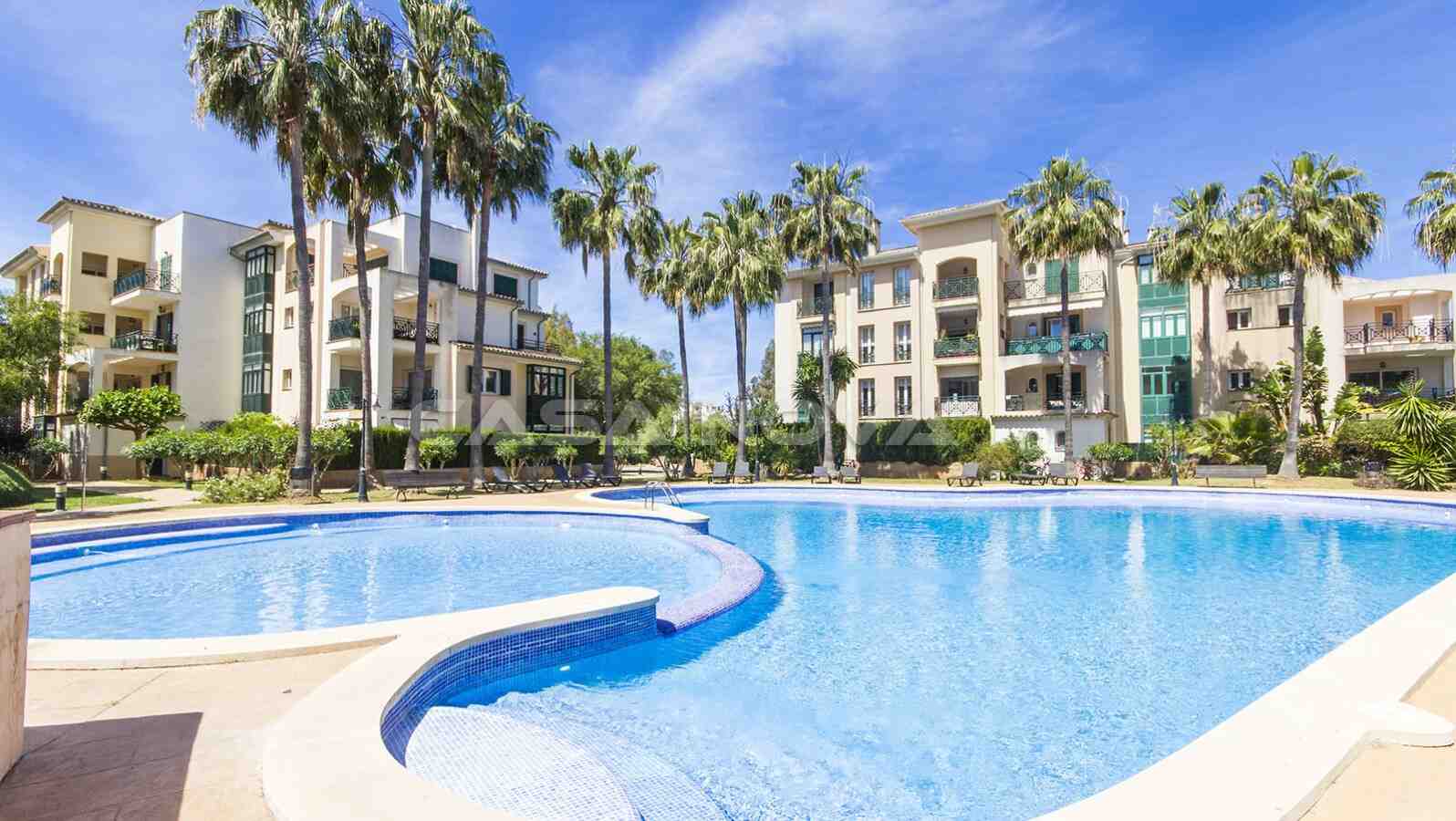 Mallorca Immobilien: Dieses charmante und großzügige Apartment befindet sich in einer begehrten Wohnanlage in fußläufiger Entfernung zum wunderschönen Sandstrand von Santa Ponsa im Südwesten Mallorcas.