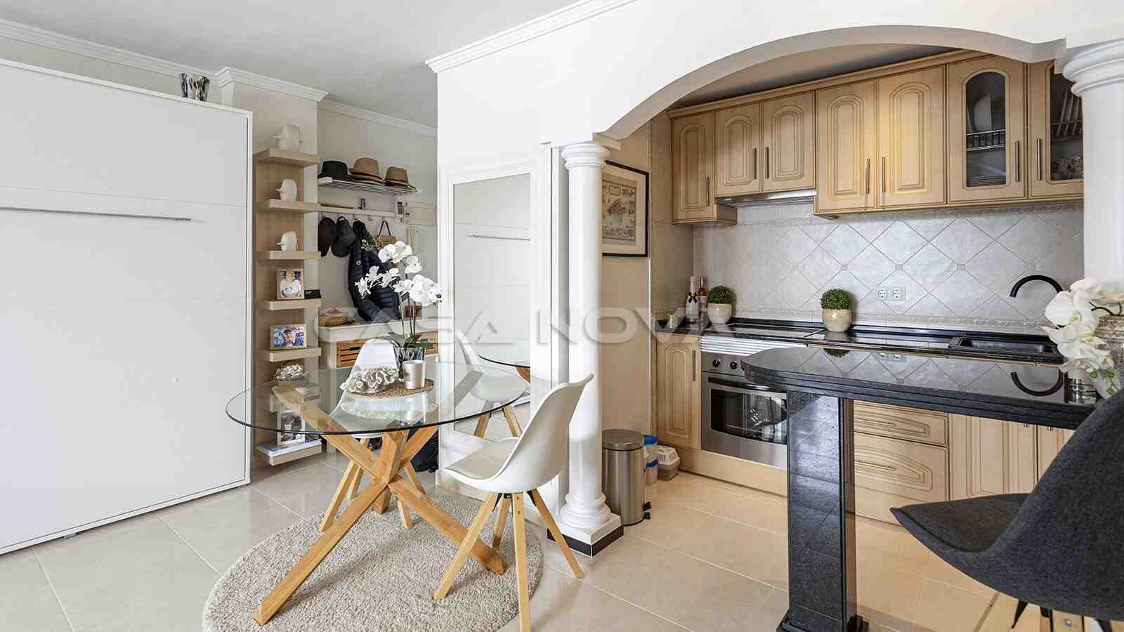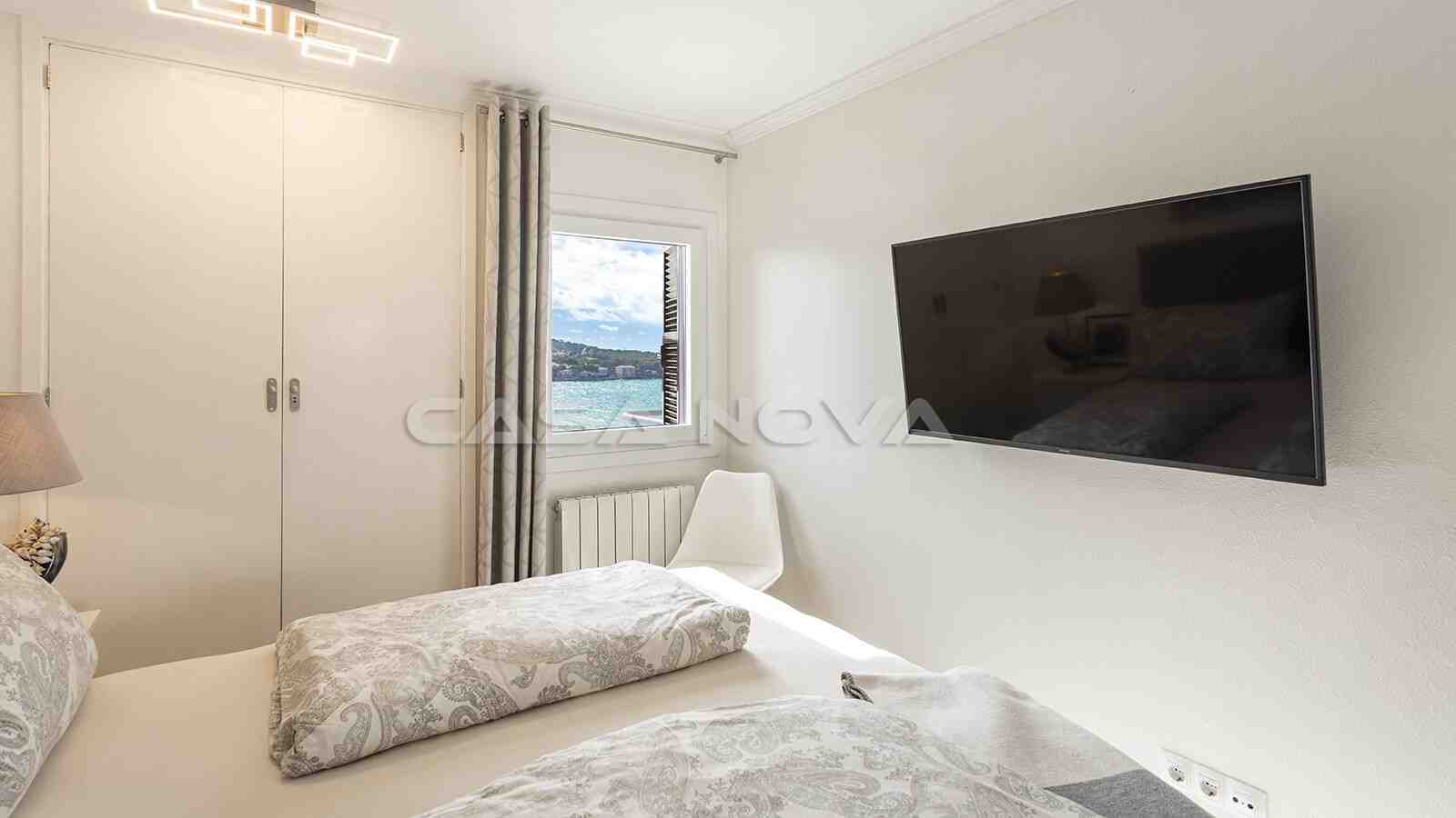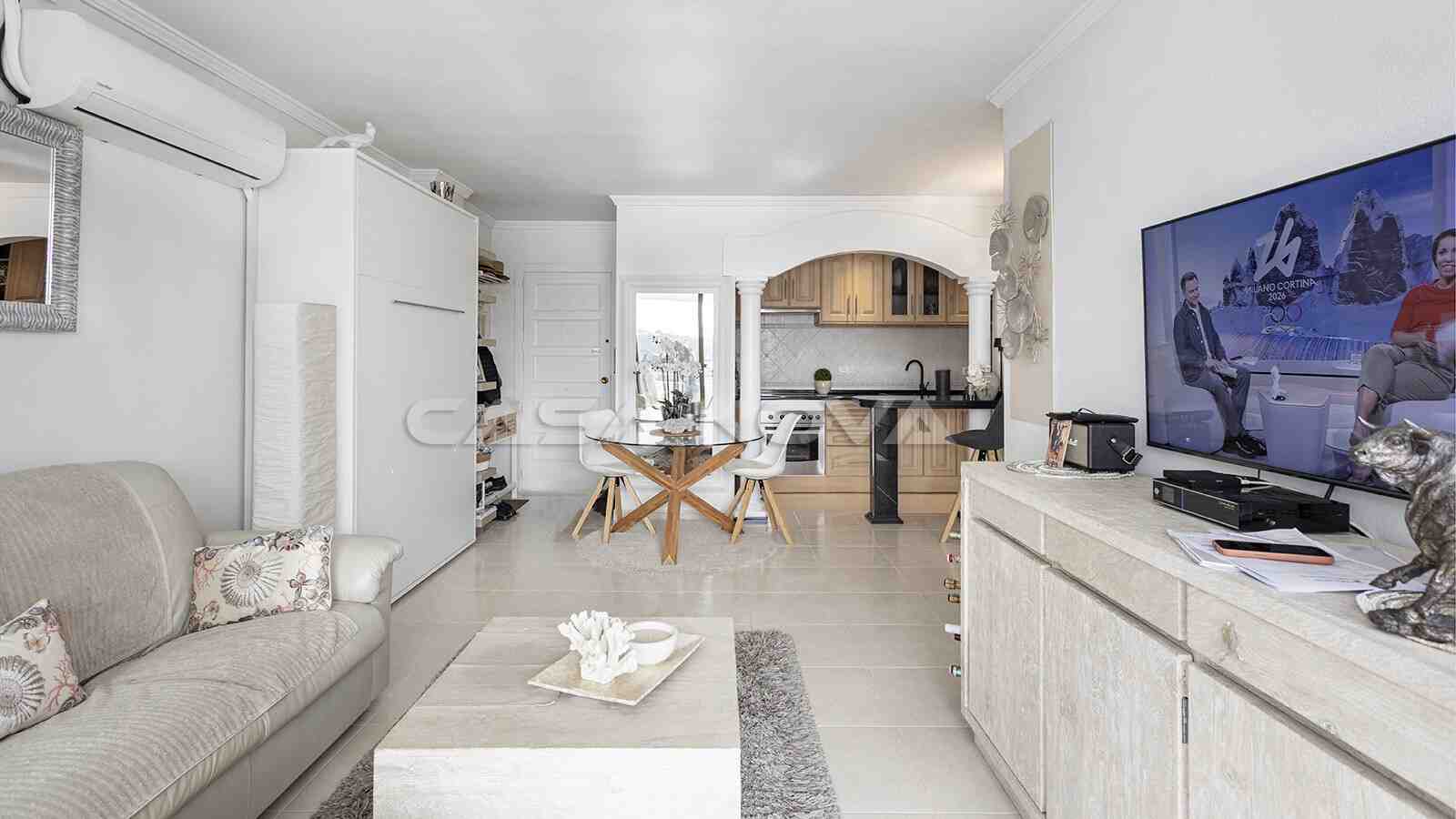 This attractive apartment has a living area of approximately 58 m2, includes a terrace offering stunning sea views over the bay. It features an open-plan living/dining area that opens onto a fully equipped kitchen with appliances. The apartment offers 1 bedroom with sea views and 1 bathroom. Additional features include gas central heating, hot and cold air conditioning, double-glazed aluminium windows, awnings, tiled floors, fitted wardrobes, and an intercom system. The apartment is located on the fourth floor of a well-maintained apartment building comprising a total of 90 flats. There is also a communal swimming pool and lift access.