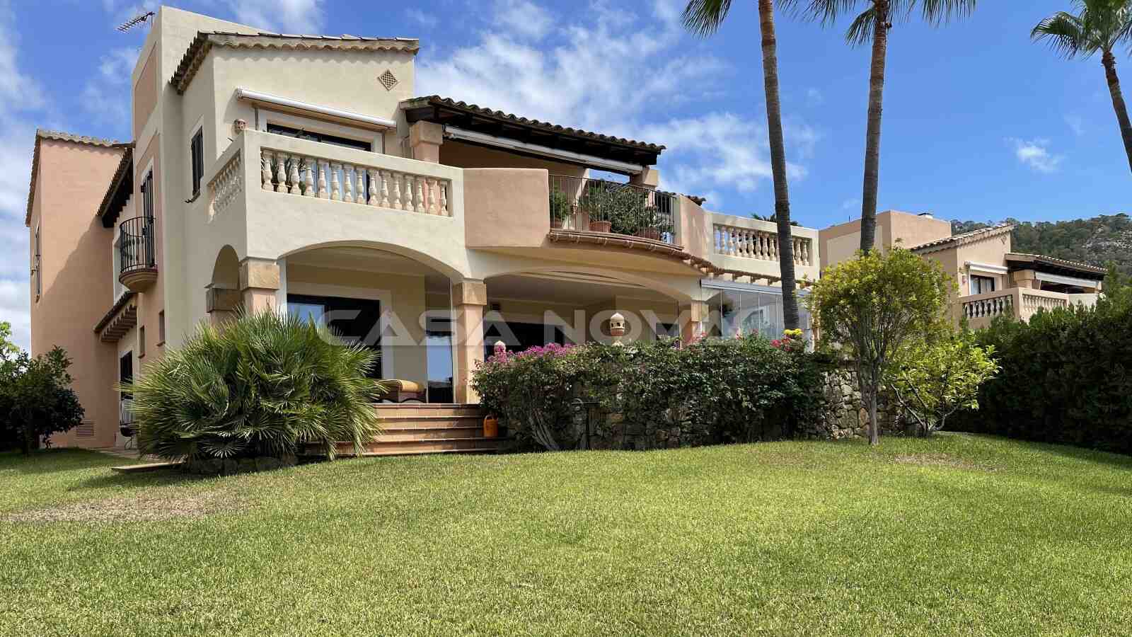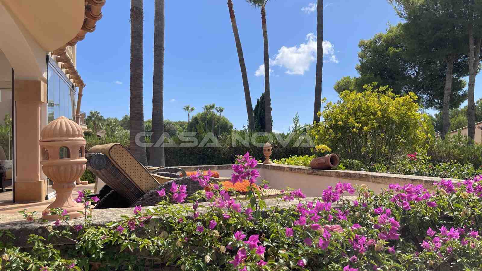 The spacious room layout on one level and a private garden characterise this Mallorca property. On a living area of approx. 210 m2 there are 3 bedrooms, dressing room, 3 bathrooms (2 of them en suite), a guest WC, a bright living/dining area, an open modern fitted kitchen with electrical appliances from Miele, a utility room and a storage room. This dream property impresses with its high-quality furnishings and luxurious interior, which is fully included in the purchase price. The following features offer a high level of living comfort: Underfloor heating, air conditioning h/c, a fireplace, double-glazed aluminium windows with screens, partly natural stone floors, SAT TV, built-in wardrobes, wooden beamed ceilings and much more. A garage with direct access to the flat and a parking space complete this property. In addition, a Mercdes GLA 200d with Spanish licence plates is included in the price. The quiet and unobstructable location characterises this exclusive and private golf residence. The complex offers the owners a large communal pool surrounded by several sun terraces.