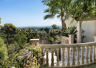 The Mediterranean Mallorca villa is situated on a plot of approx. 1,050 m2 and offers a generous living space of approx. 450 m2. The exclusive villa has 5 bedrooms with fitted wardrobes, 4 bathrooms en suite, a bright living area with fireplace, a dining room, a fully equipped fitted kitchen with utility room, a storage room and a guest WC. From the spacious terrace you can enjoy spectacular panoramic views as far as the bay of Palma de Mallorca. The villa was modernised in 2024 and has the following features Air conditioning h/c, wooden windows with double glazing, wooden shutters, alarm system with video surveillance, intercom, marble and stone tiled floors, bodega, wooden beamed ceilings, natural stone cladding, SAT TV and fibre optic connection. The outdoor area impresses with a heated saltwater pool, surrounded by an easy-care garden, as well as a lounge area with BBQ grill. The villa also has a separately accessible living room in the basement, which can be used as a fitness area or additional guest room. A double garage and 3 parking spaces complete the offer.