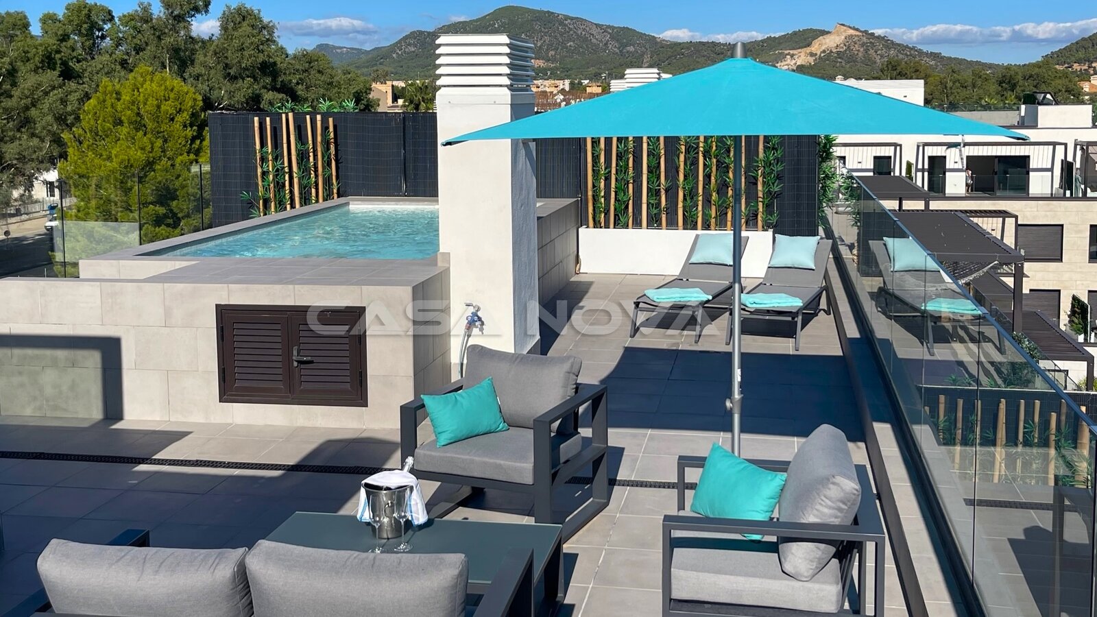 This charming property has a living area of approx. 90 m2, 3 bedrooms, 2 bathrooms (one en suite), a modern open kitchen with electrical equipment, as well as a utility room. From the living area you have access to a spacious open terrace of approx. 51 m2, which invites you to relax. The highlight is the approx. 102 m2 roof terrace with private pool and unforgettable views to the majestic Tramuntana mountains. This sensational penthouse leaves nothing to be desired and impresses with the best construction quality. The high quality features are: Air conditioning hot/cold via heat pump, underfloor heating, gas heating, double glazed aluminium windows, electric shutters, tiled floors, fitted wardrobes, a domotic bus system and much more. The community area offers a wonderful pool surrounded by sun terrace, a childrens playground, as well as a fitness area, thus completing this unique offer.