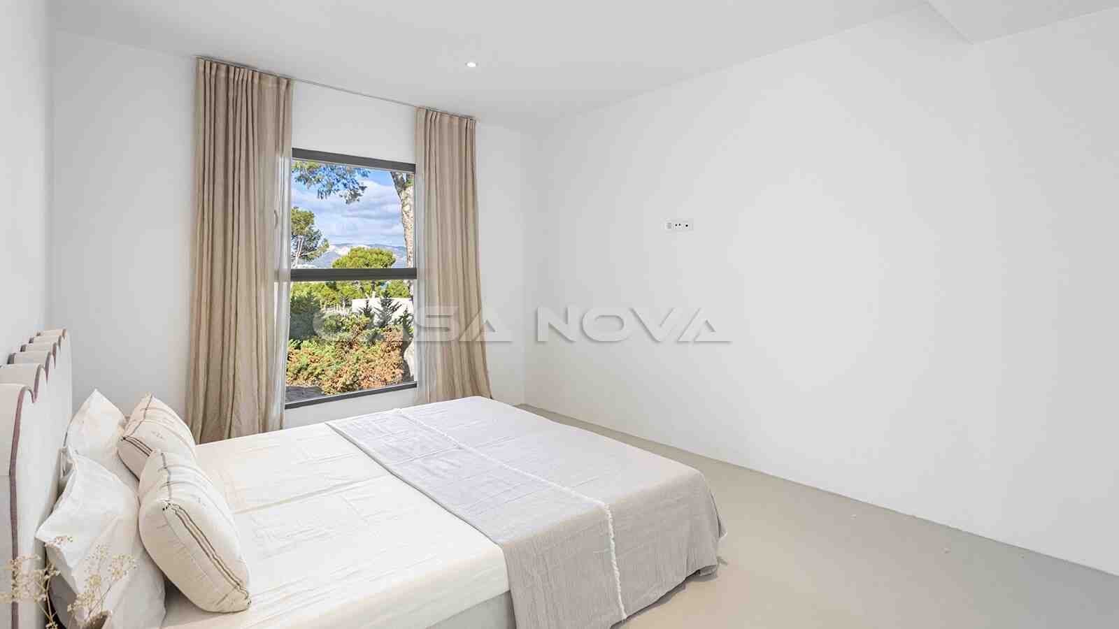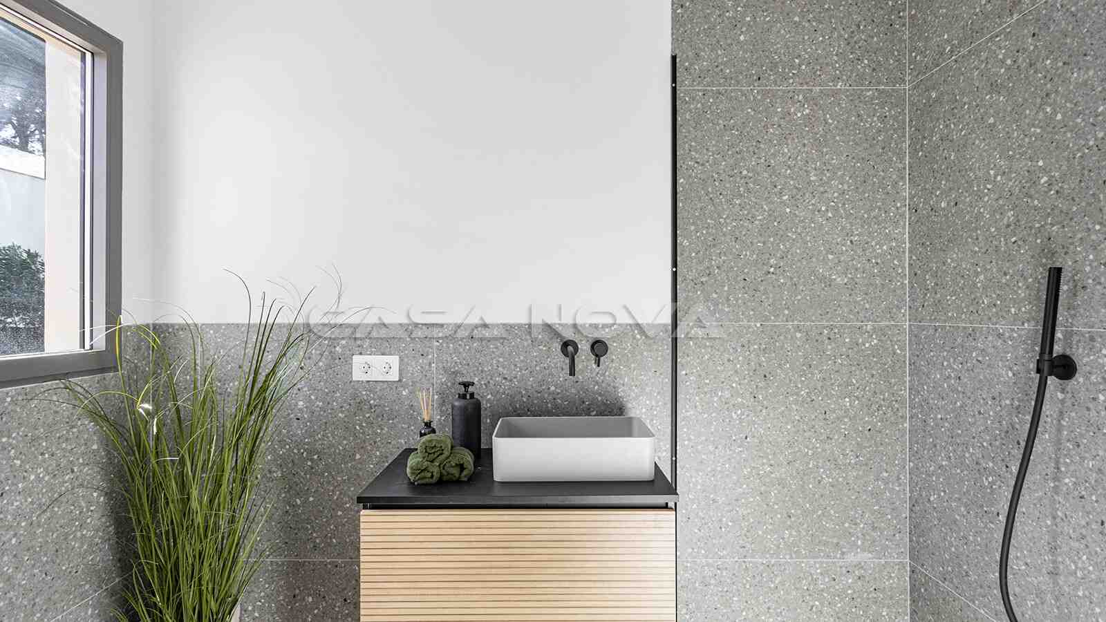 The modern villa extends on a generous plot of 997m2 and offers a living area of approx. 205m2. The delightful property has a total of three bedrooms (with the option to extend to four bedrooms) and four bathrooms, three of which are en-suite. The interior of this exquisite villa combines modern design with the highest standards of living, creating an oasis of comfort and elegance. An easy-care micro-cement floor runs throughout the villa, giving the rooms a contemporary, minimalist aesthetic. The villa is equipped with underfloor heating powered by an environmentally friendly heat pump and air conditioning (h/c), which ensures that the indoor climate is always perfectly regulated, regardless of the season. The appealing open-plan fitted kitchen, equipped with high-quality electrical appliances, invites you to cook and enjoy and connects seamlessly with the spacious living and dining area. For practical everyday use, there is also a utility room and a storage room, which offer sufficient storage space for various household items and supplies. When it comes to the building services, nothing is left to be desired.A striking feature of the building services is the comprehensive Domotic system. This computer-controlled system links all of the villa's technical installations, enabling centralized control of many functions via a user-friendly interface. The villa is also equipped with an alarm system and video intercom. Fiber optics and telephone connection are of course also available. Parking is available in the form of a parking space, secured by an electric access gate. The interesting offer is rounded off by the cozy outdoor area. A private saltwater pool and a beautifully landscaped garden invite you to relax in the sun.