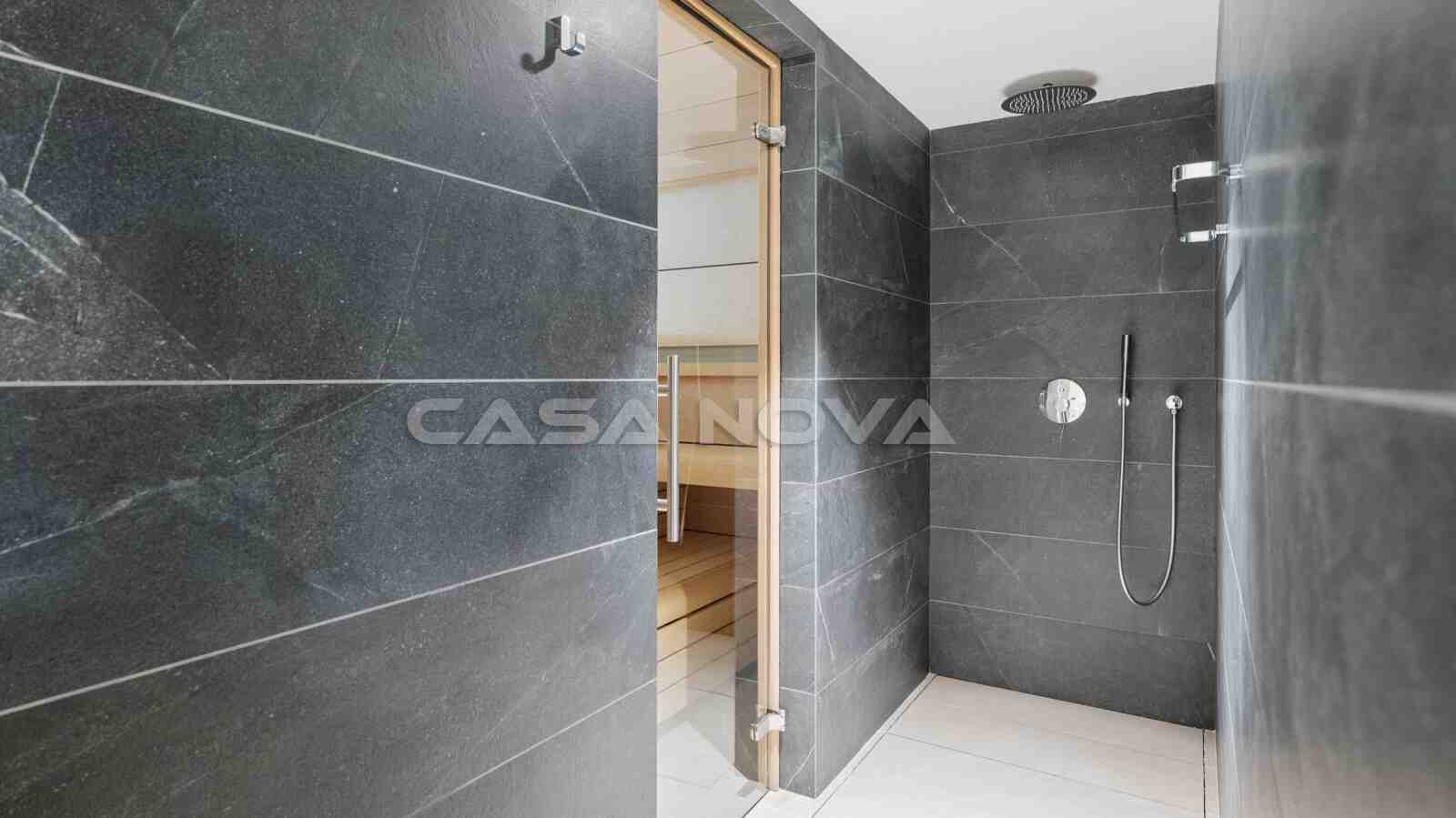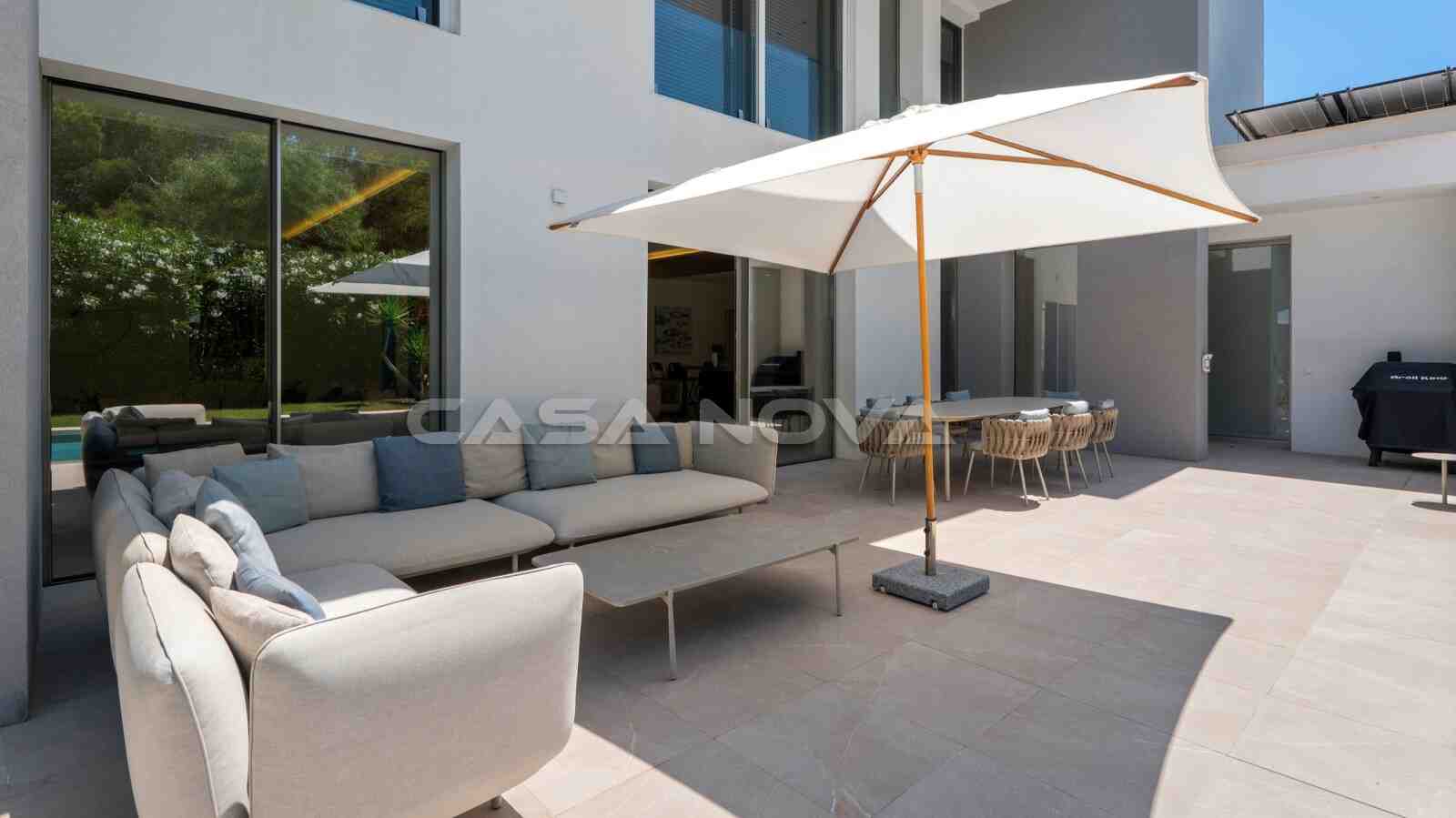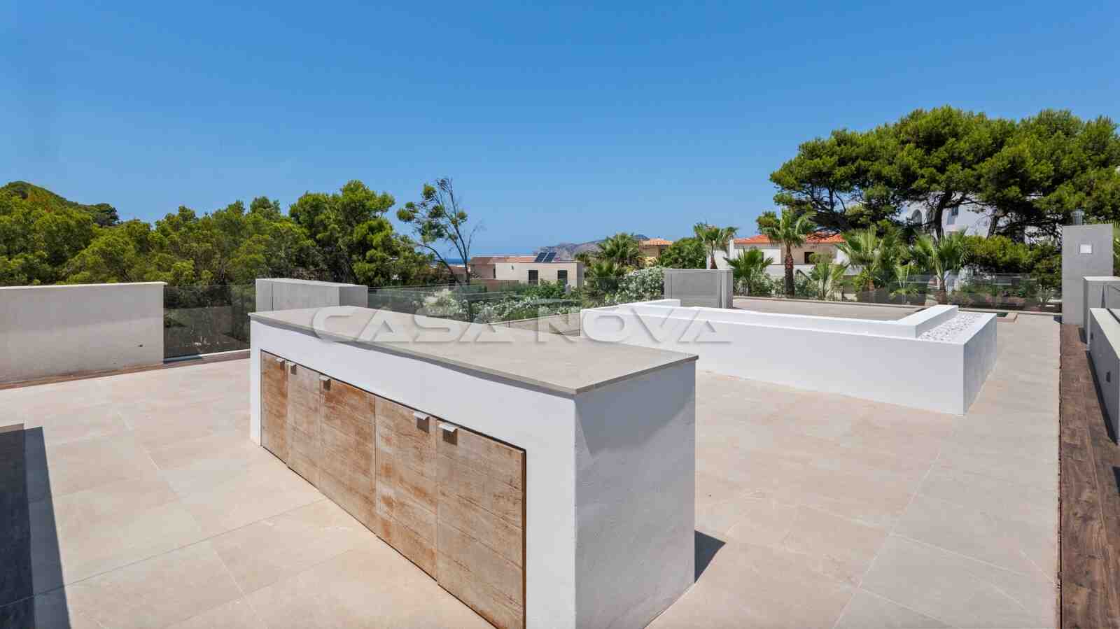 The villa is situated on a plot of approximately 1.080 m2 and was completed in 2018. The built area is 378 m2 and is spread over two levels. The ground floor is divided into a bright living/dining room, an open-plan, fully equipped fitted kitchen with electrical appliances, 1 bedroom with fitted wardrobes and 1 bathroom, as well as a utility room. Upstairs there are 3 further bedrooms and 2 bathrooms, one of which is en suite. The top-of-the-range, high-quality furniture is included in the price. Outside, there is a Mediterranean garden with automatic irrigation and a pool with an outdoor shower. Beautiful open and covered terraces make for the perfect living and holiday experience. The highlight is the private 70 m2 roof terrace with lounge area and BBQ summer kitchen. The property features underfloor heating via heat pump, hot/cold air conditioning, double-glazed aluminium windows, music system, stone flooring, guest WC, telephone connection and satellite TV. A sauna with fitness area completes this exclusive property. A double garage with electric door is also available.
