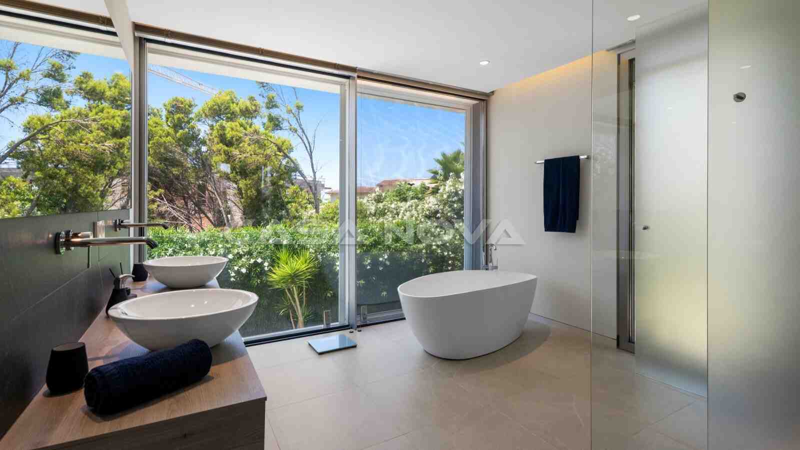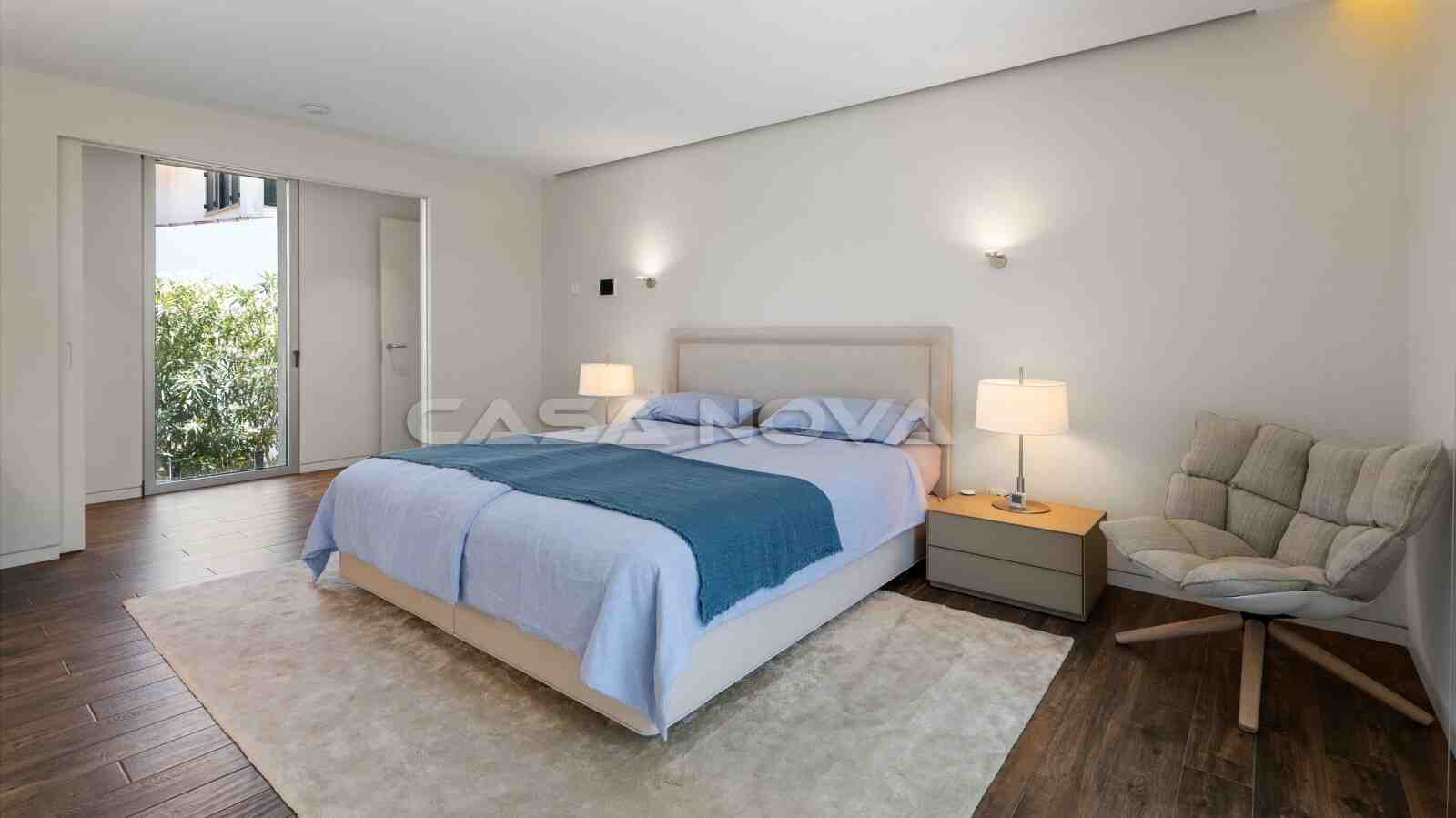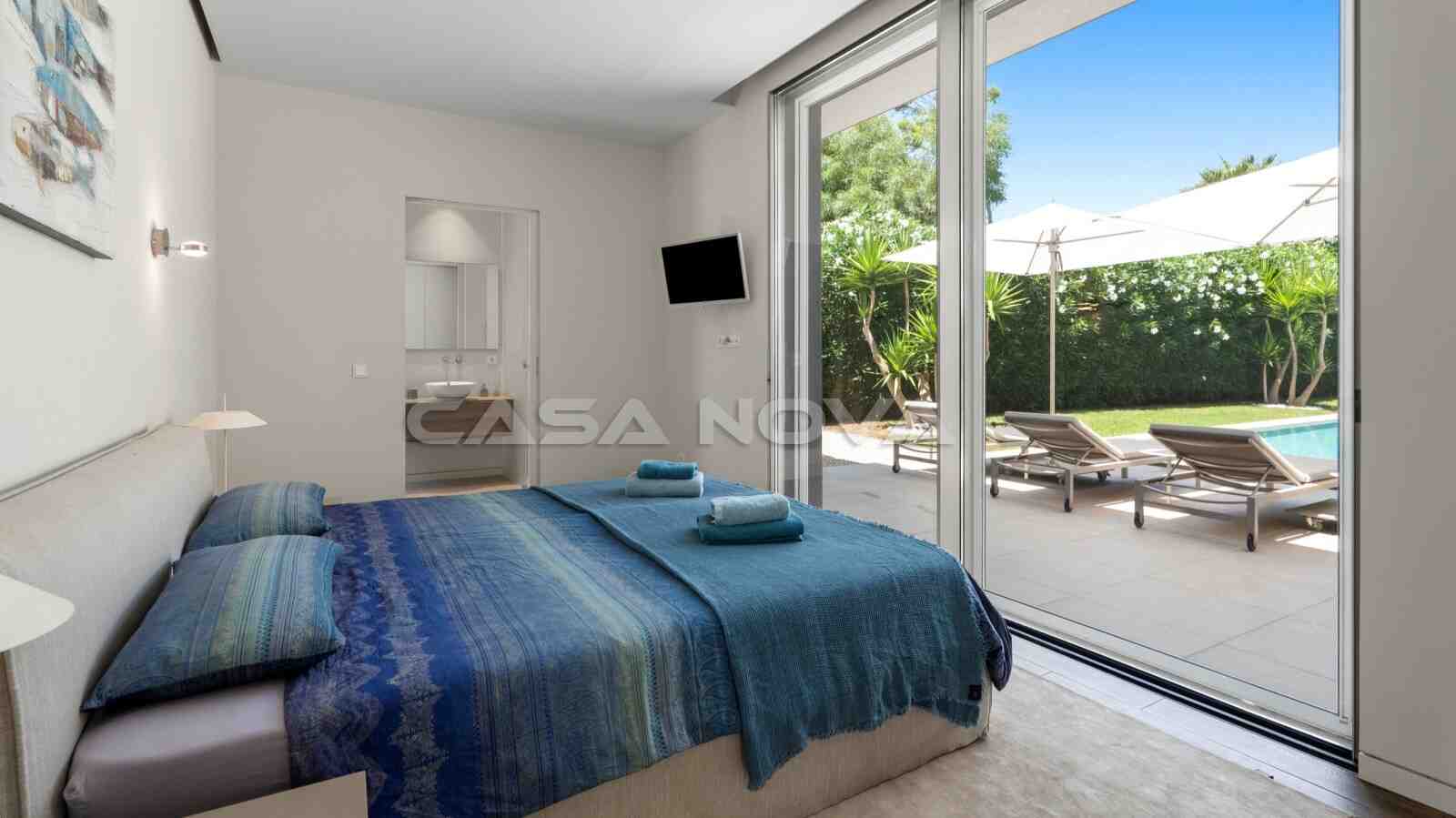 The villa is situated on a plot of approximately 1.080 m2 and was completed in 2018. The built area is 378 m2 and is spread over two levels. The ground floor is divided into a bright living/dining room, an open-plan, fully equipped fitted kitchen with electrical appliances, 1 bedroom with fitted wardrobes and 1 bathroom, as well as a utility room. Upstairs there are 3 further bedrooms and 2 bathrooms, one of which is en suite. The top-of-the-range, high-quality furniture is included in the price. Outside, there is a Mediterranean garden with automatic irrigation and a pool with an outdoor shower. Beautiful open and covered terraces make for the perfect living and holiday experience. The highlight is the private 70 m2 roof terrace with lounge area and BBQ summer kitchen. The property features underfloor heating via heat pump, hot/cold air conditioning, double-glazed aluminium windows, music system, stone flooring, guest WC, telephone connection and satellite TV. A sauna with fitness area completes this exclusive property. A double garage with electric door is also available.