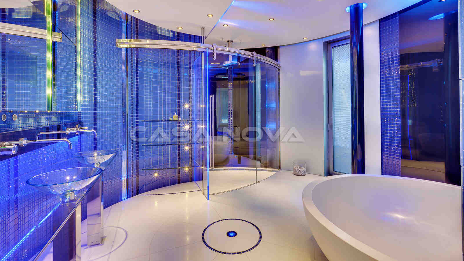 This special luxury real estate Mallorca is located in private location in Sol de Mallorca, in the southwest of the island. The special, minimalist architecture, finest materials and best qualities as well as latest technology meet highest standards. The Villa is a technical masterpiece and offers pure comfort. The entrance hall is located on the upper level, as well as a designer kitchen, a large dining room and a bedroom with bathroom en suite. The guest area with 2 bedrooms and bathrooms en suite are as well on this level. The ground floor consists of a spacious living room with designer fireplace, master bedroom with dressing room and bathroom en suite, a further bedroom with bathroom, laundry room and equipment room, as well as wellness area with steam bath and a noble, air-conditioned wine cellar. The beautiful outdoor area impress with water fontains, heatable pool, BBQ area and summer kitchen. A small sandy beach is just a short walk away.