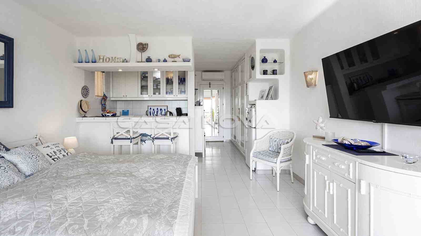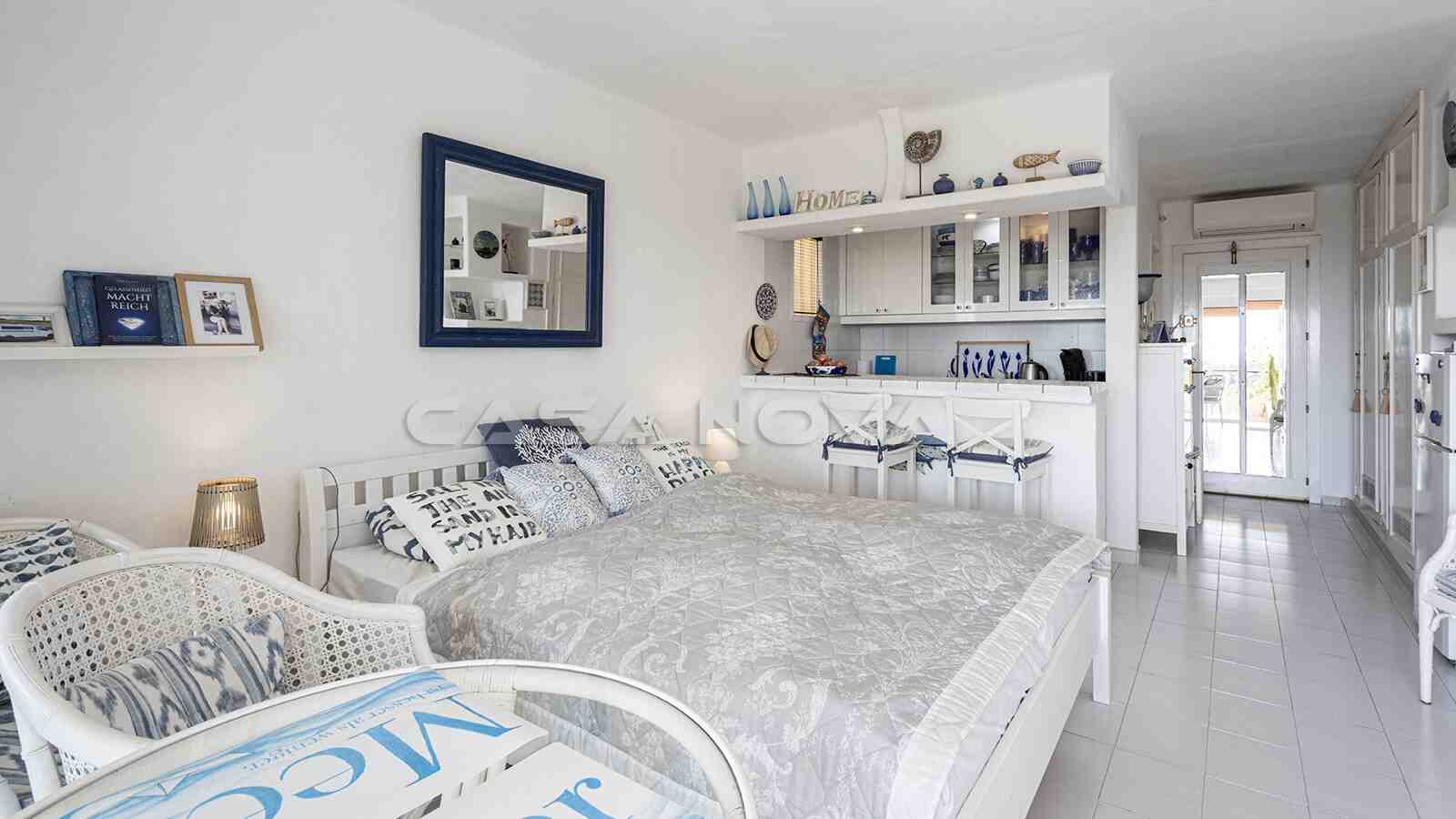 La bonita propiedad ofrece una superficie de aprox. 32 m2 más una terraza cubierta de aprox. 11 m2. El estudio se divide en una luminosa sala de estar/dormitorio, una cocina abierta equipada, un cuarto de baño y un trastero independiente. La propiedad es ideal como residencia vacacional o apartamento de fin de semana y es fácilmente accesible debido a su proximidad al aeropuerto. Otras características importantes son: suelo de baldosas, ventanas de PVC con doble acristalamiento, portero automático, televisión por satélite y conexión telefónica. Desde la terraza cubierta se tiene una vista espectacular de las montañas, la zona verde y el mar. El estudio está bien cuidado y decorado con elementos mediterráneos. La piscina comunitaria con terraza solárium ofrece posibilidades adicionales de relajación. El estudio también cuenta con una plaza de aparcamiento en el complejo.