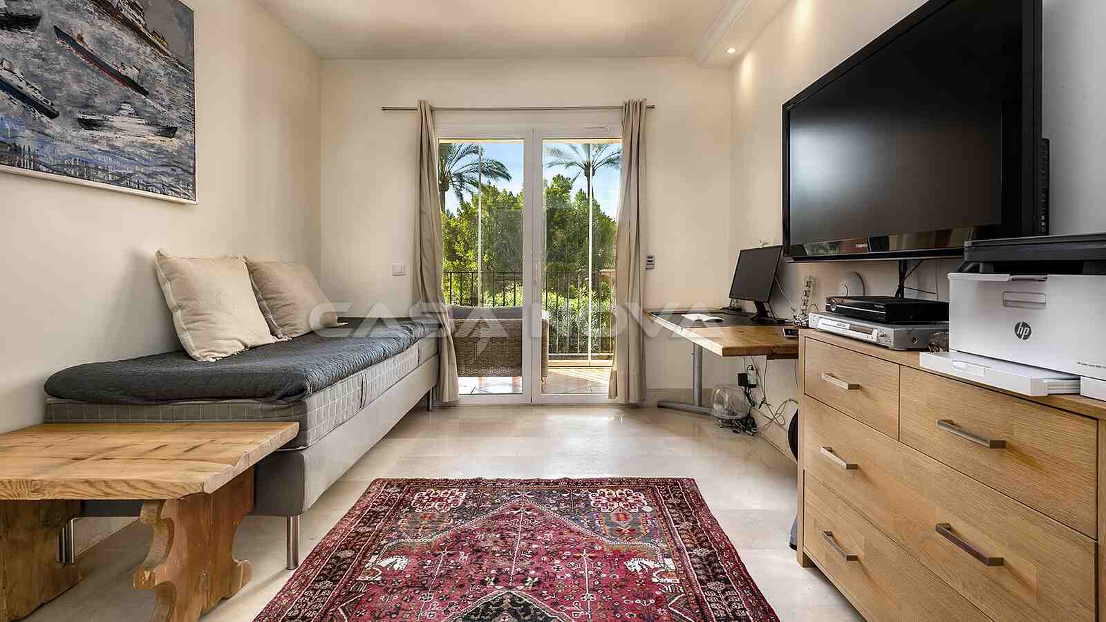 El apartamento tiene una superficie habitable de aproximadamente 146 m2 y una terraza cubierta de aproximadamente 20 m2. Cuenta con 3 dormitorios y 3 baños, 2 de ellos en suite, un salón-comedor abierto, una cocina moderna totalmente equipada, un trastero y un lavadero. Desde la terraza se disfruta de una hermosa vista al jardín y a la piscina. Los paneles de cristal crean un efecto de jardín de invierno y proporcionan un ambiente agradable. Otras características incluyen: ventanas de PVC con doble acristalamiento, aire acondicionado, suelos de mármol, portero automático, armarios empotrados y conexión de teléfono y fibra óptica. El edificio dispone de una plaza de aparcamiento subterráneo. Además de dos piscinas comunitarias y una bonita zona exterior, el complejo también cuenta con una piscina cubierta. Las propiedades inmobiliarias en el suroeste de Mallorca son una buena inversión de valor para el futuro.