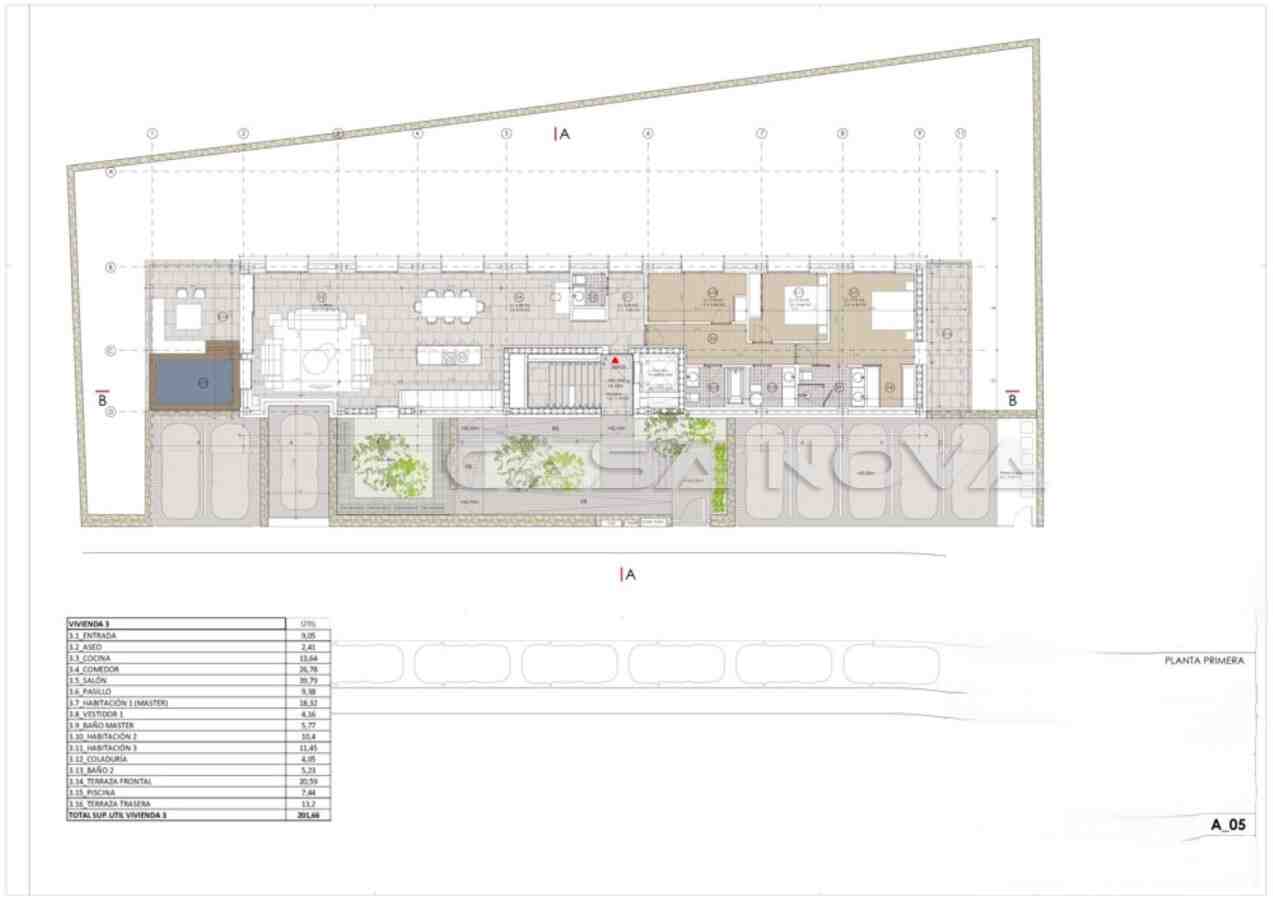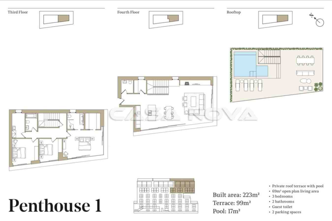 La moderna instalación se finalizó en 2025. Con una superficie construida de 223 m2 distribuida en dos niveles, este ático ofrece habitaciones amplias y el máximo confort. La planta principal destaca por su salón-comedor diáfano con chimenea y grandes ventanales que inundan la estancia de luz natural. La cocina, equipada con electrodomésticos, está perfectamente integrada en el salón-comedor, lo que permite seguir conversando con la familia o los invitados en un ambiente agradable mientras se cocina. En la planta superior hay 3 dormitorios amplios y 2 baños, uno de ellos en suite. Todas las habitaciones tienen espectaculares vistas al mar. Una escalera conduce a la terraza privada de la azotea, desde donde se puede disfrutar de unas vistas despejadas del mar y de hermosas puestas de sol. Sumérjase y disfrute de la frescura de la idílica y tranquila piscina. Entre otras características adicionales, se incluyen calefacción por suelo radiante, aire acondicionado frío/calor, ventanas de aluminio con doble acristalamiento, armarios empotrados, alarma, videoportero, suelos de parqué, vestidor, lavadero, aseo de invitados, sistema domótico y de bus (tecnología doméstica controlada por ordenador), así como dos plazas de garaje con puerta eléctrica y puerta de acceso. El edificio dispone de ascensor.