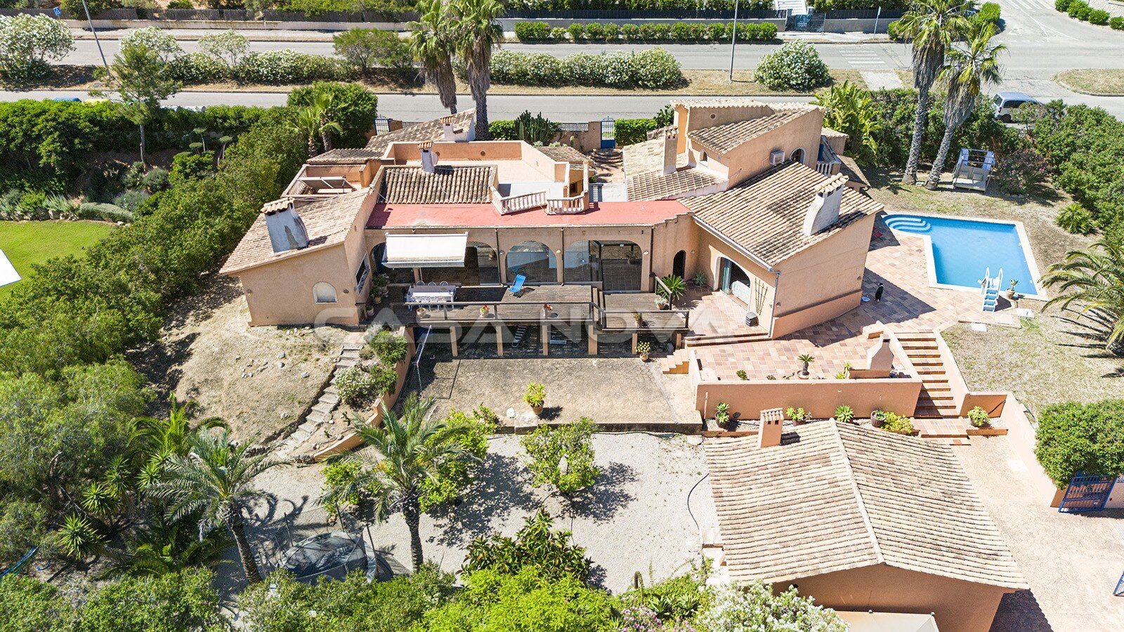 Con un total de 4 luminosos dormitorios y 4 cuartos de baño, 3 de ellos en suite, esta propiedad no sólo ofrece un amplio espacio para su familia e invitados, sino también una calidad de vida de primera clase. Especialmente destacable es la casa de invitados de aprox. 58 m2, que está equipada con su propia entrada, baño y sala de estar y ofrece así a los visitantes una estancia extremadamente agradable. Para garantizar una temperatura ambiente agradable durante todo el año, hay aire acondicionado (f/c), calefacción central de gas y una chimenea de leña abierta, que también sirve como elegante elemento de diseño. Hay mucho espacio de almacenamiento gracias a varios trasteros y grandes armarios empotrados en las habitaciones. También hay un estudio disponible para su uso, donde se puede trabajar sin ser molestado. La propiedad se complementa con una zona exterior igualmente atractiva, que consta de un amplio jardín, una piscina de agua dulce de aprox. 40 m2 con zona de barbacoa y un salón chill-out. Por supuesto, también dispone de aparcamiento.Un garaje y cochera plazas de aparcamiento están disponibles para sus vehículos. Aunque la propiedad se encuentra en una de las calles principales de Nova Santa Ponsa, su inteligente posición y especialmente la orientación de la terraza hacia la zona verde y arbolada, garantiza silencio, paz y tranquilidad para sus habitantes.