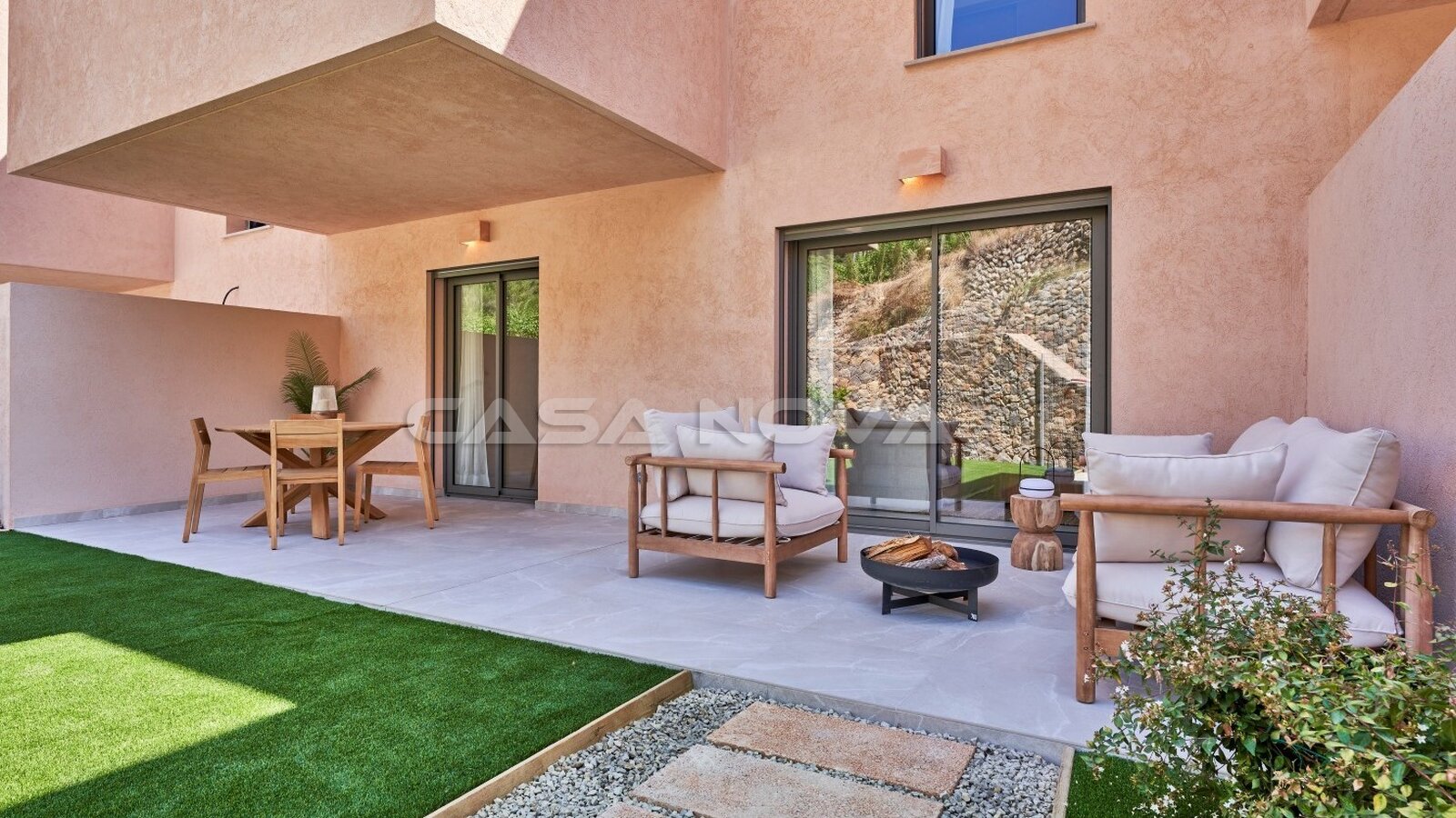 Nada más entrar, la propiedad impresiona por su suelo porcelánico Saloni de alta calidad, que impresiona por su diseño moderno y su gran durabilidad. En el exterior, las mismas baldosas se utilizan en una versión antideslizante. La cocina totalmente equipada viene con electrodomésticos de alta calidad de Siemens o marcas equivalentes - incluyendo un horno, placa de inducción y campana extractora. Los generosos armarios empotrados ofrecen mucho espacio de almacenamiento. El aire acondicionado (frío/calor) y la calefacción por suelo radiante en los baños garantizan un clima agradable. Además, un sistema fotovoltaico con una potencia de 1 kW por unidad residencial contribuye a una reducción sostenible del consumo de energía. Destaca especialmente la terraza de aprox. 34 m² orientada al suroeste con una zona ajardinada privada de 5 m². Desde aquí se tiene acceso directo a la zona comunitaria cuidadosamente ajardinada con piscina y zonas verdes, ideal para relajarse y disfrutar. Por supuesto, cada unidad tiene su propia plaza de aparcamiento con acceso directo a la propiedad, lo que ofrece comodidad y privacidad adicionales.
