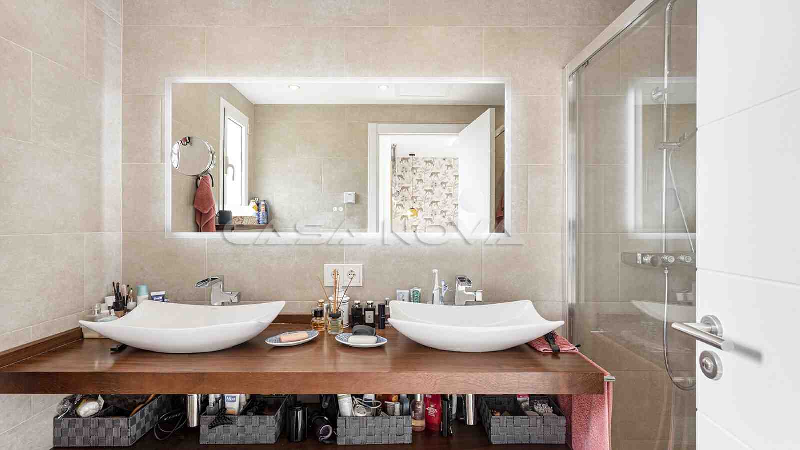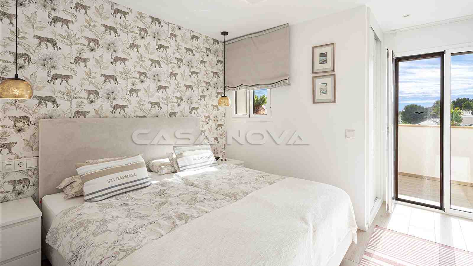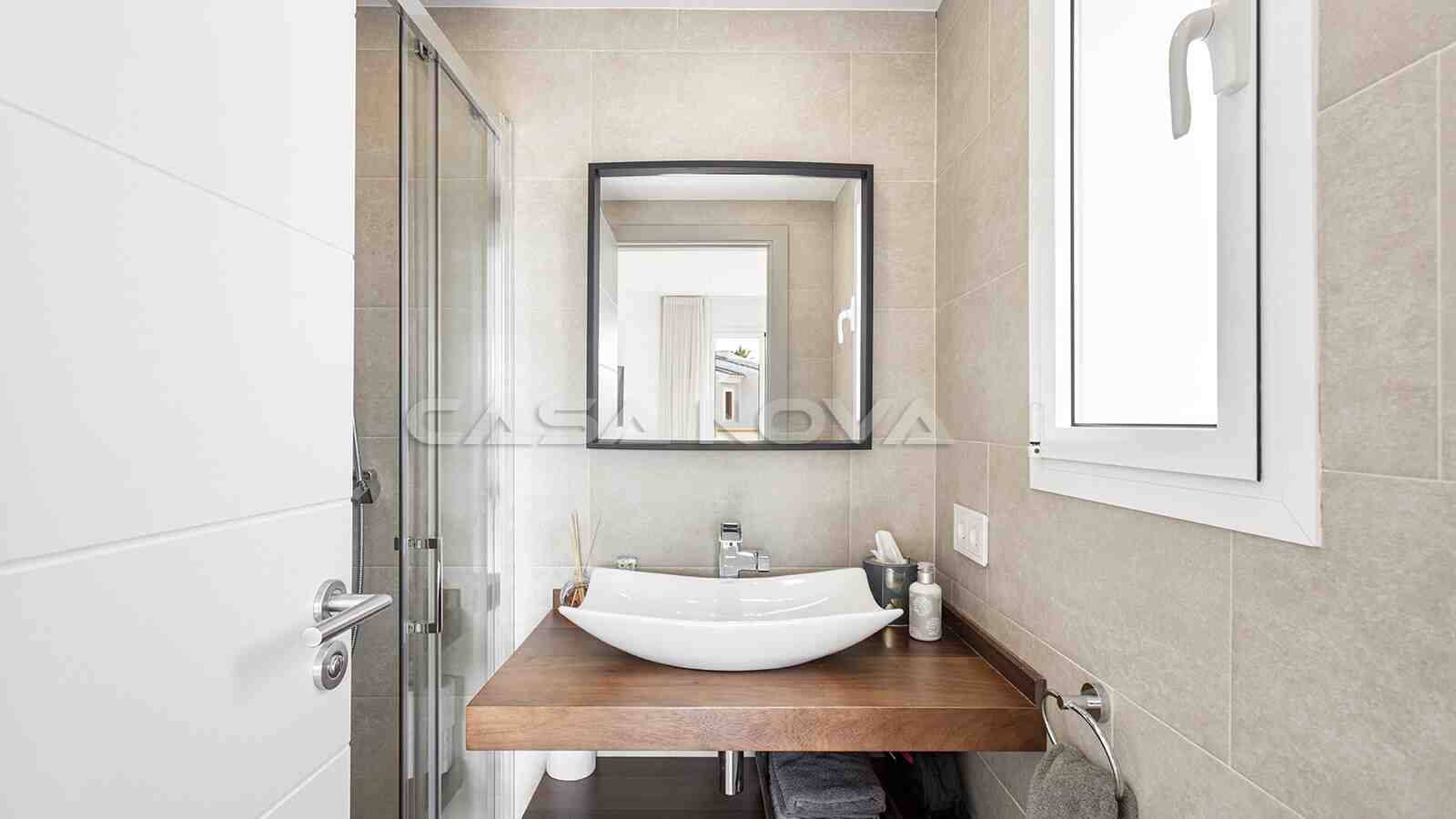 La villa se encuentra en una cuidada parcela de 280 m² y tiene una superficie construida de 168 m². La propiedad se distribuye en dos plantas. En la planta baja hay un luminoso salón-comedor con una acogedora chimenea y acceso a la terraza y al jardín, una cocina totalmente equipada con elegantes armarios altos y una cocina nueva, un dormitorio doble con armarios empotrados, un cuarto de baño en suite y un aseo para invitados. En la planta superior hay dos dormitorios más con baños en suite. El dormitorio principal tiene acceso a una terraza privada de unos 11 m². Las características de la villa son: suelo de baldosas con aspecto de madera, calefacción por suelo radiante en los baños, aire acondicionado con función de refrigeración y calefacción, así como calefacción por infrarrojos, ambos controlables a través de una aplicación, armarios empotrados, techos con vigas de madera, ventanas de PVC con doble acristalamiento, parasoles y mosquiteras, cámaras de vigilancia Eufy, portero automático, televisión por satélite y conexión de fibra óptica. La zona ajardinada de estilo mediterráneo, de unos 149 m², cuenta con riego automático y una «casita» para espacio de almacenamiento adicional. La zona comunitaria cuenta con una refrescante piscina rodeada de zonas para tomar el sol con vistas al campo de golf y zonas verdes comunitarias. Dos plazas de aparcamiento justo delante de la puerta principal con estación de carga (Wallbox) para coches eléctricos completan esta magnífica oferta. Opcionalmente, se puede adquirir una acción de golf con carrito de golf para el club Santa Ponsa.