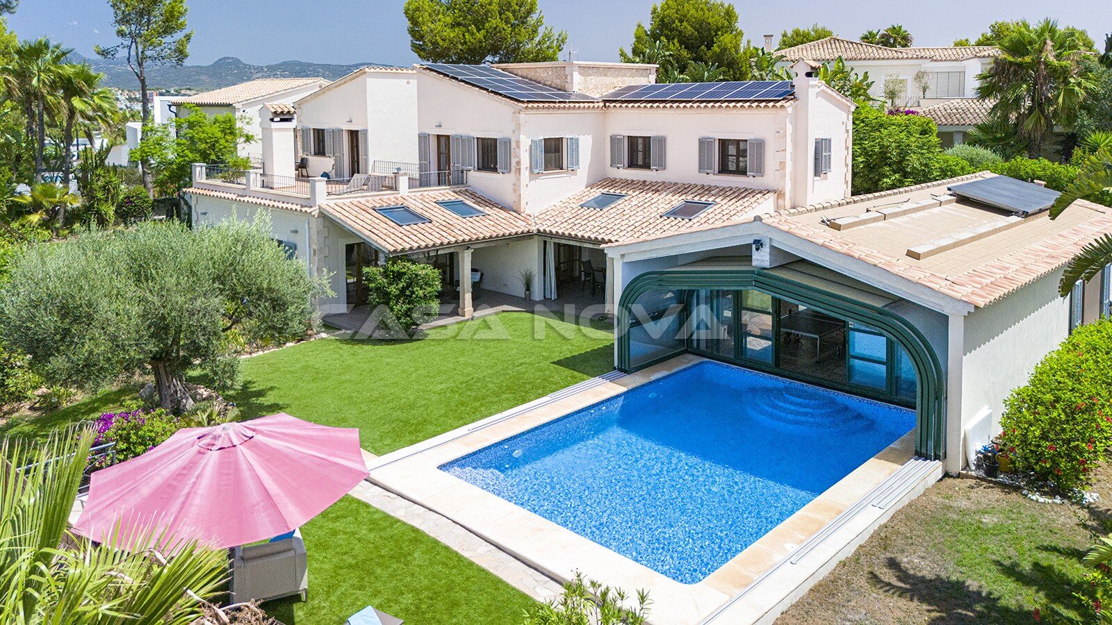 En una generosa parcela de 1.610 m², una superficie construida de aprox. 580 m² ofrece mucho espacio para la familia y los invitados con un total de 5 dormitorios, 4 baños (3 en-suite) y un aseo de invitados. Cabe destacar el apartamento de invitados independiente con acceso propio, que garantiza privacidad y flexibilidad - ideal para visitas o como retiro para estancias más largas. Una acogedora sala de estar con chimenea y característicos techos con vigas de madera crea un ambiente cálido y acogedor. La cocina amueblada de alta calidad está equipada con electrodomésticos Siemens y ofrece mucho espacio para las tareas culinarias. Un lavadero, un trastero, armarios empotrados, así como una zona de fitness, baño de vapor y sauna proporcionan un confort adicional. La propiedad está equipada con calefacción por suelo radiante (operado por una bomba de calor) y calefacción central de gasoil y tiene aire acondicionado (frío / calor), lo que garantiza temperaturas agradables durante todo el año. El elegante suelo de baldosas y las ventanas de madera con doble acristalamiento y contraventanas tradicionales de madera completan el elegante interior. El mobiliario está disponible opcionalmente. Esta villa también satisface las más altas exigencias en cuanto a servicios de construcción: un moderno sistema domótico permite el control central de muchas funciones. La conexión de fibra óptica, la televisión por satélite, la conexión telefónica y el sistema de filtrado de agua potable garantizan el confort de la vida moderna. Un sistema de alarma videovigilado y un sistema de videoportero garantizan la máxima seguridad. La zona exterior está tan bien pensada como el interior: el cuidado jardín cuenta con un sistema de riego automático e iluminación exterior ambiental. Podrá relajarse en el elegante salón chill-out, en una barbacoa con familiares y amigos o en la piscina privada climatizada con ducha exterior contigua. Con cinco plazas de garaje, la propiedad también ofrece mucho espacio para vehículos y espacio de almacenamiento adicional.
